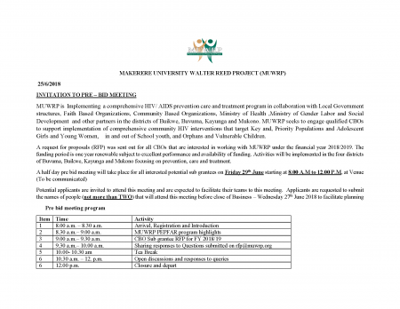 A half day pre bid meeting will take place for all interested potential sub grantees on Friday 29th June starting at 8.00 A.M to 12.00 P.M, at Venue (To be communicated)