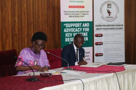 The Speaker of the Parliament of Uganda Rt. Hon. Rebecca Kadaga has requested the Parliamentary HIV Committee and the Budget committee to consider a vote in the 2019/2020 national financial budget to support health research in the country. Kadaga was presiding over the high level parliamentary dialogue focusing on HIV Vaccine research in Uganda which was held in the Parliamentary Members Lounge on Tuesday 5th June, organized by the Parliamentary Forum on quality health service delivery in partnership with the Vaccine Interest Group in Uganda (VIG).
